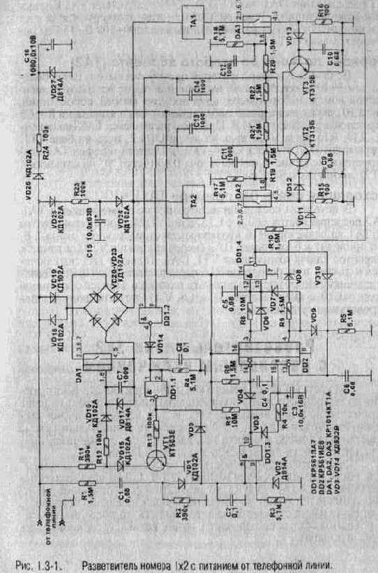 На рис. 1.3-1 представлена принципиальная схема разветвителя номера 1х2 с питанием от телефонной линии. В состав схемы входят: