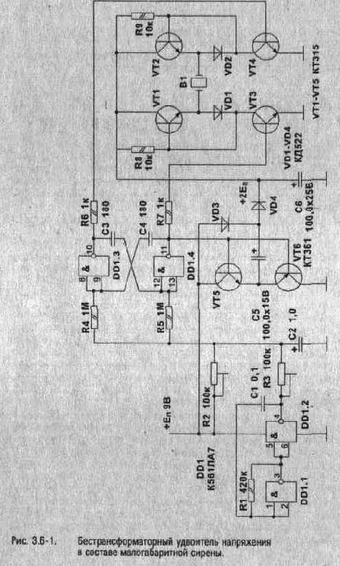 На рис. 3.6-1 приведена схема преобразователя напряжения 9 В -> 18В для устройств, потребляющих не более 100 мА при напряжении питания 18В. Преобразователь приведен в составе практической схемы сирены для систем охраны и сигнализации.