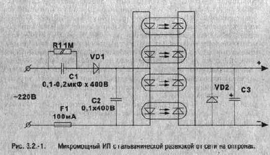 Микромощные ИП с гальванической развязкой от сети ~220 В можно выполнить с применением оптронов, включив их последовательно для увеличения выходного напряжения (рис. 3.2-1.). Перенос энергии осуществляется посредством однонаправленного светового потока внутри оптрона (оптрон содержит светоизлучающий и поглощающий элементы), таким образом, гальванической связи с сетью не возникает.